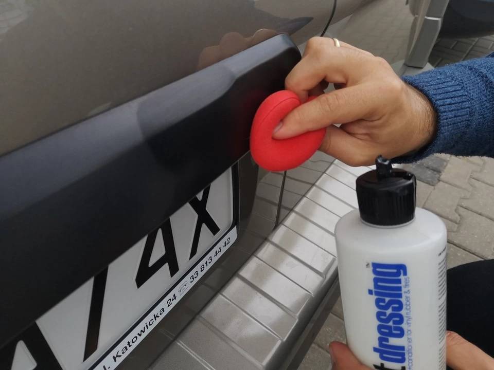После нанесения средства для наружных пластиков серый бампер не станет полностью черным, но такие препараты будут работать намного дольше, чем силикон, содержащийся в «химии» из первого примера. Долговечность покрытия (до нескольких недель) – при регулярном использовании препарата каждый раз обеспечивается еще лучший эффект. Такие меры не помогают удалить и замаскировать глубокие царапины и потертости, но они работают, когда наши пластиковые детали не сильно повреждены.