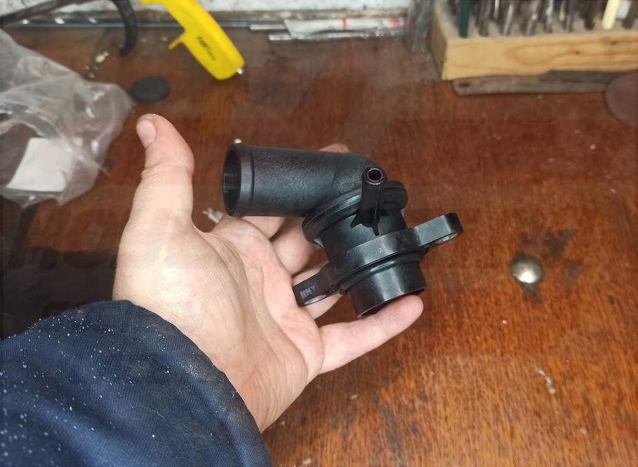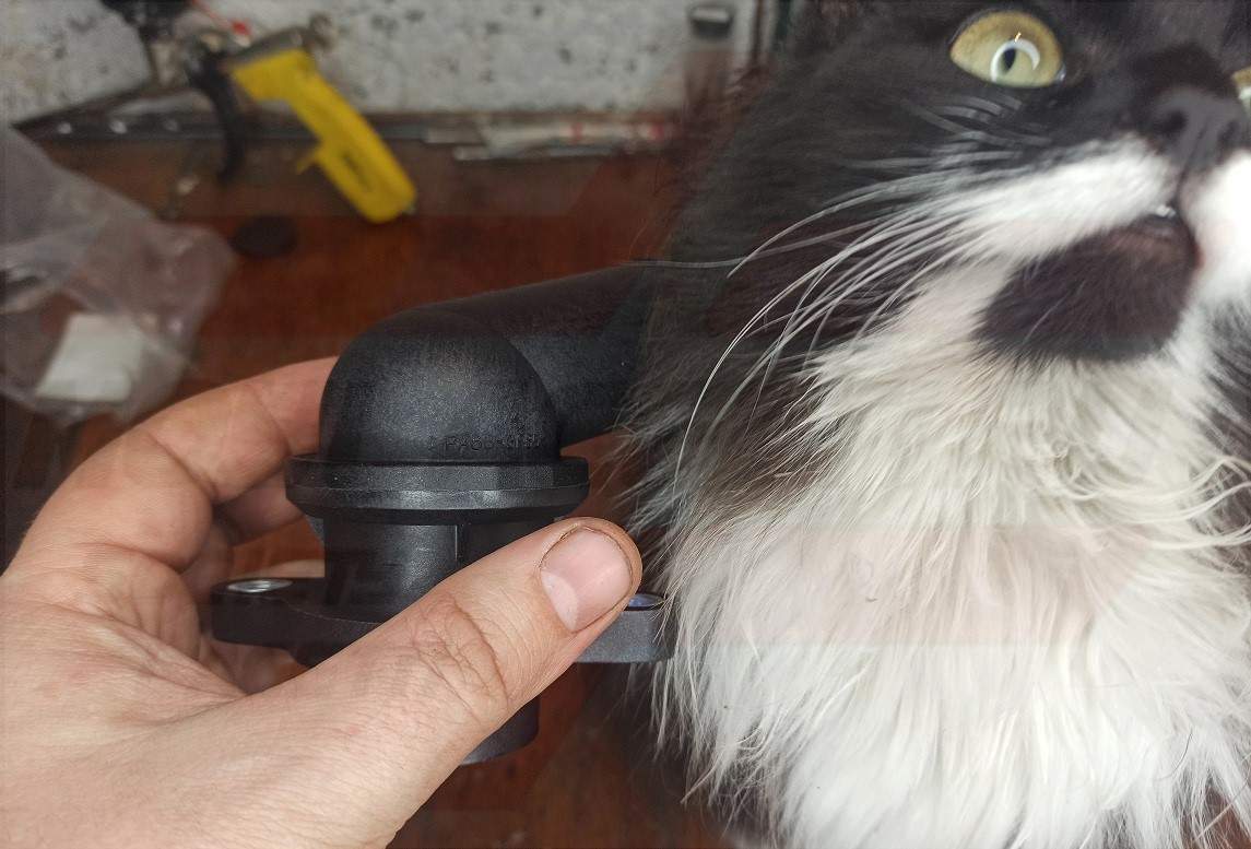 Аккуратно устанавливаем термостат на двигатель. Закручиваем два болта крепления. Монтируем патрубки и заливаем охлаждающую жидкость в расширительный бачок.