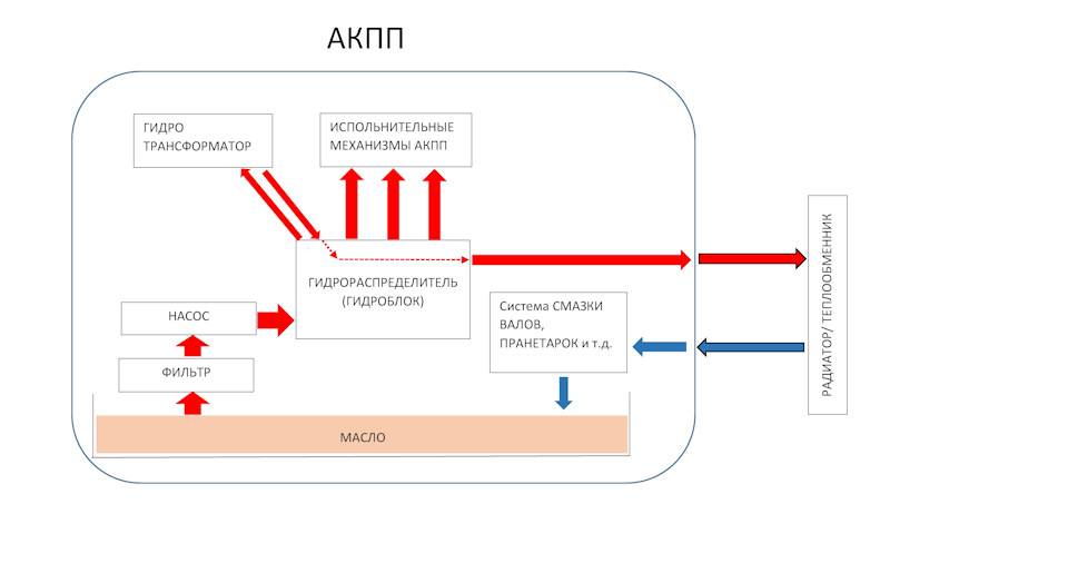 Итак, в первой части — покажем схему устройства системы охлаждения акпп, основные конструктивные особенности системы охлаждения АКПП.