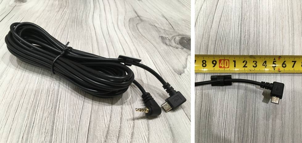 Кабель подключения камеры, длиной около 5,5 метров, с разъемами MicroUSB (в камеру) и MiniJack (в видеорегистратор):