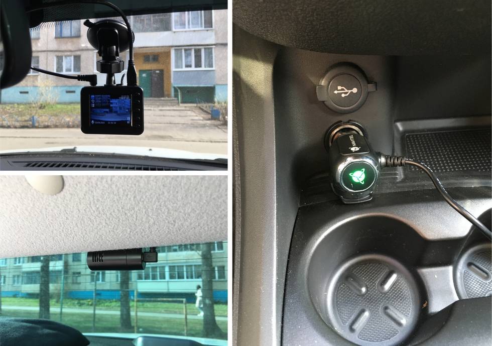 Устанавливаем видеорегистратор и выносную камеру в автомобиль, подключаем питание: