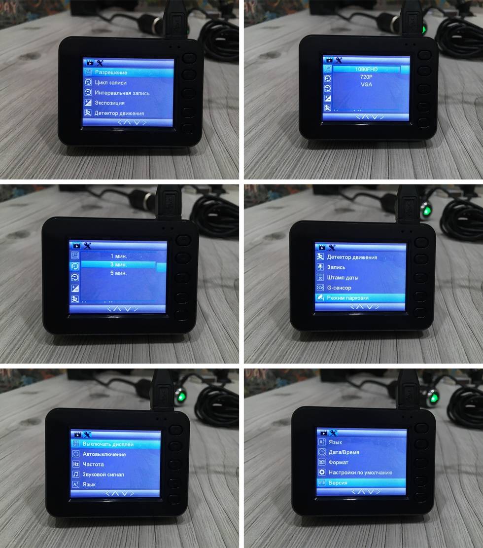 Пробежимся по настройкам, среди которых присутствует выбор разрешения видеозаписи, продолжительность фрагментов цикличной записи, дата и время, язык меню, время до отключения экрана, включение парковочного мониторинга, и так далее: