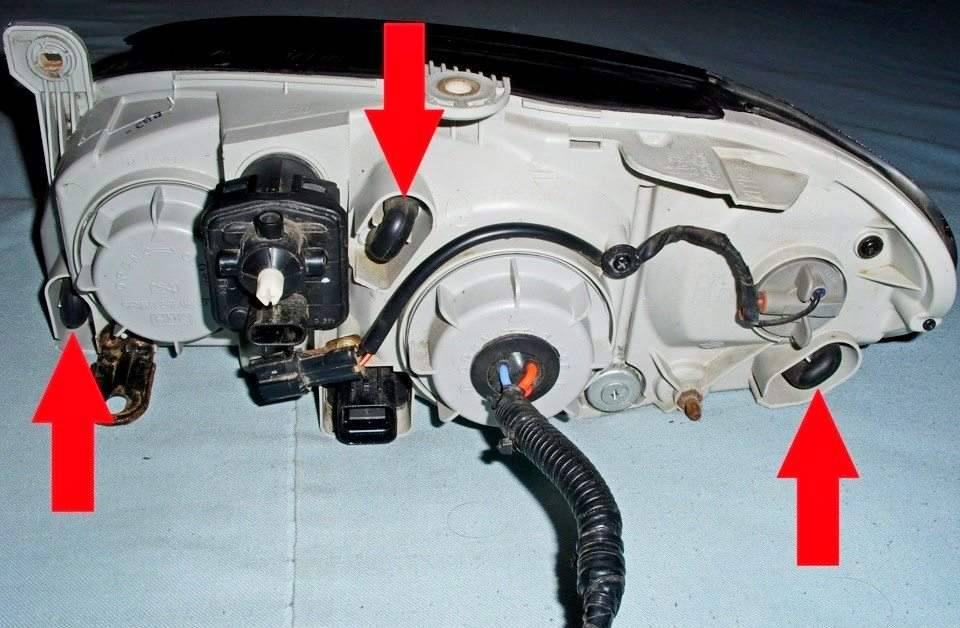 - демонтаж фары. Для этого потребуется сначала отсоединить все крепления, удерживающие фару с внутренней стороны, разъединить контакты и снять гидрокорректор. Также нужно снять облицовку радиатора и декоративные накладки фары. После выполнения всех этих операций осветительный прибор легко вынимается;