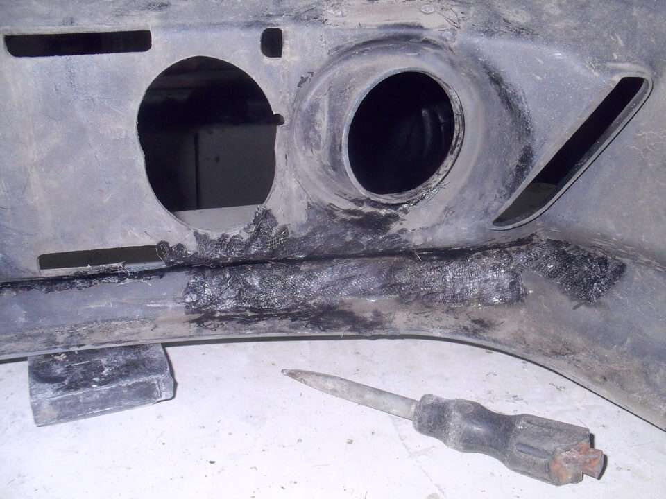 При работе со старым бампером к вышеописанному плану действий добавятся пункты по обработке поверхности шпаклевкой, избавления от расколов и трещин паянием.