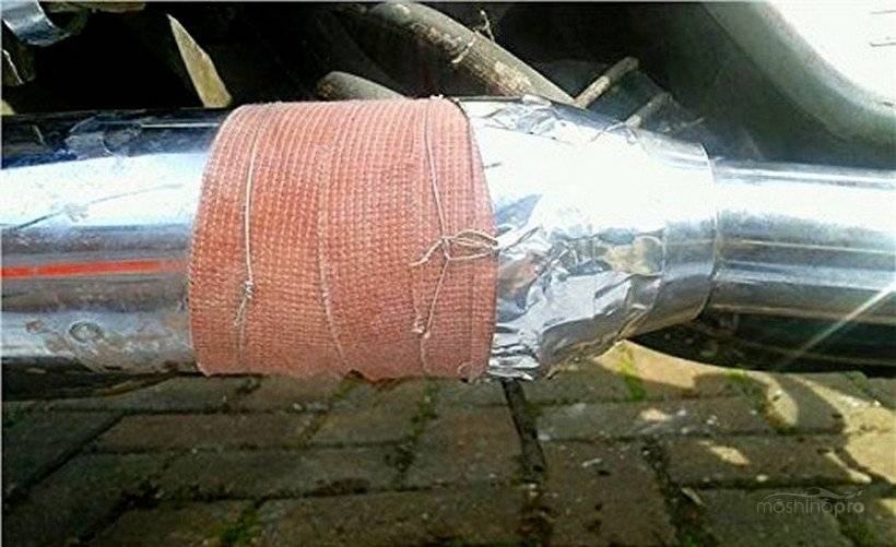 - Заделать лентой место повреждения, по кругу обхватывая глушитель.