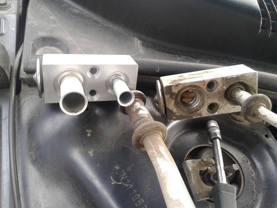 - Терморегулирующий вентиль (ТРВ). В его задачи входит контроль уровня хладагента, а также регулировка давления в соответствии с количеством фреона, и с температурой. При выходе из строя терморегулирующего вентиля наблюдается неустойчивая работа кондиционера, его периодическое отключение, обмерзание шлангов, неровная подача холодного воздуха в салон.