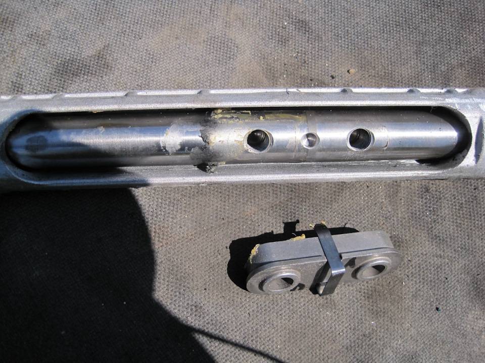 Извлеченная из корпуса рейка, опорная втулка и отверстия для сверления через которые выбивается игольчатый подшипник
