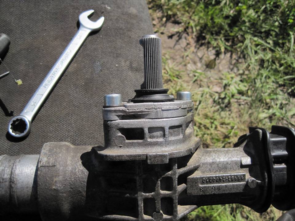 Потом необходимо слить всю жидкость из рейки в пластиковую емкость через распределительный шланг, при этом необходимо завести двигатель и крутить руль вправо и влево до конца пока вся жидкость выйдет из системы. Далее откручиваем хомуты и гайки в рейке, на валу рулевого управления отвинчиваем болт,находящийся возле самого пола, с внутренней части салона с водительской стороны. Рейку не спеша тянем на себя небольшими вспомогательными движениями в разные стороны, ведь шестерня, которая расположена на валу рулевой колонки, тяжело снимается. Когда всё удалось и рейка снята, аккуратно вытягиваем весь механизм в правую сторону, там есть свободное место.