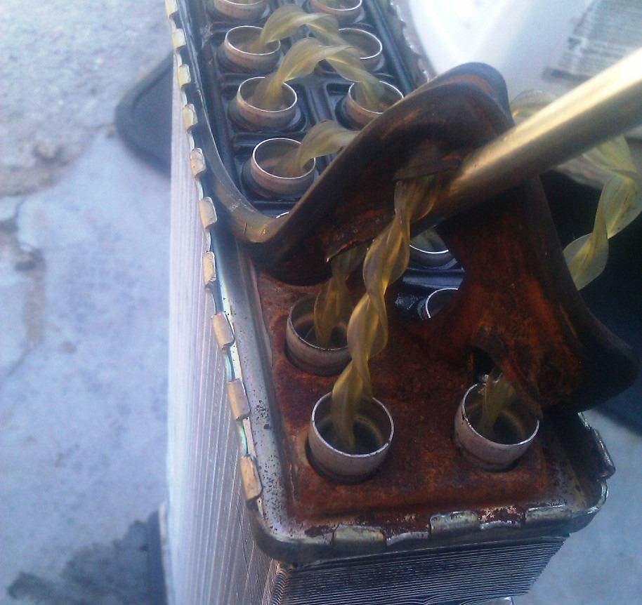 Если утечка ОЖ происходит из радиатора, его обычно меняют на новый. Ремонт с целью восстановления герметичности обычно сложен и трудозатратен. Кроме того, если радиатор давно эксплуатируется, его трубки забиваются отложениями и грязью, и, как следствие снижается теплоотдача.