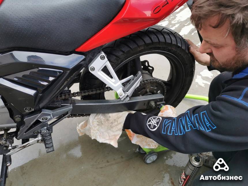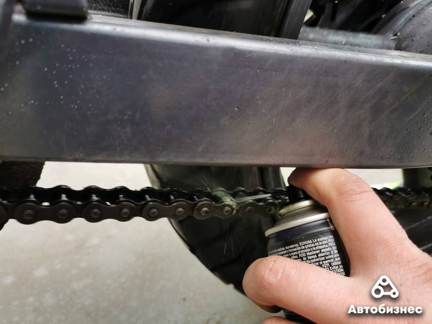 Есть два способа смазки цепи. Быстрый – вывешиваем колесо, вытираем тряпкой остатки воды после мойки, крутим колесо и смазываем цепь как на фото. Потом вытираем излишки – можно ехать.
