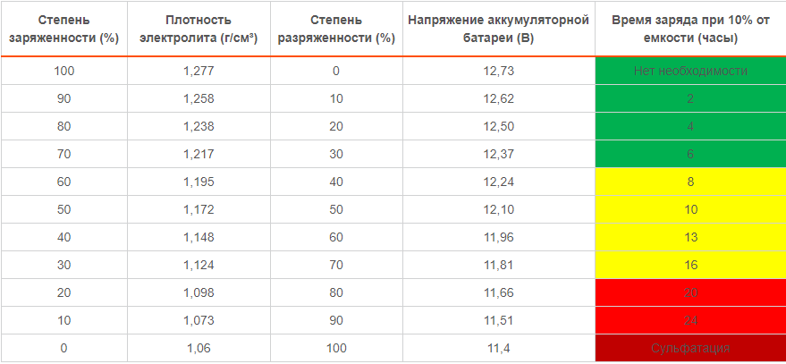 Для ориентировочной оценки требуемого времени на зарядку автомобильного аккумулятора постоянным током сначала необходимо определить степень разряженности батареи (в процентах), потом определить потерянную емкость (в Ач), а затем, выбрав величину зарядного тока, рассчитать время полной зарядки. Формула для расчета сколько по времени подзаряжать аккумулятор авто выглядит так: