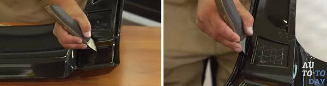 На самом спойлере делаем насечки ножом, это нужно для того, чтобы клей герметик лучше приклеился к поверхности.