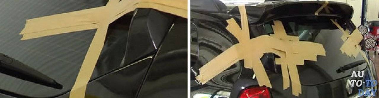Далее наступает второй этап: компонент должен быть надежно зафиксирован в выбранном положении. Для этого потребуется малярный скотч. Последний необходимо нанести так, чтобы спойлер и дверца багажного отсека не могли сместиться в сторону.