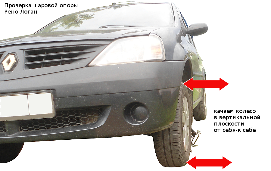 Аналогичный стук при трогании с места может появиться по причине неисправности шаровой опоры подвески. Причины ее неисправности такие же как и у рулевого наконечника. Проверяем ее покачивая вывешенное колесо в вертикальной плоскости (при этом помощник в салоне нажимает на педаль тормоза, что бы исключить неисправность ступичного подшипника).
