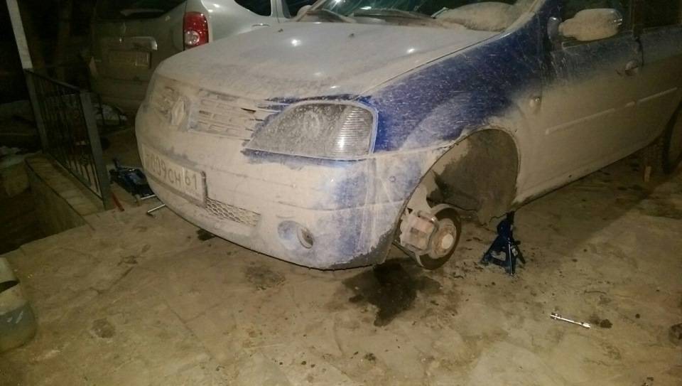 Для начала вывесил перед машины, снял колеса.(Далее все фото на новой рейке, старую снимал почти ночью и один.)