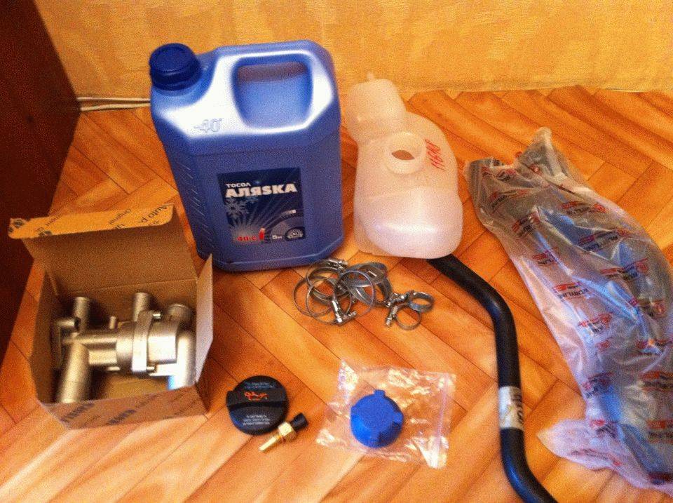 Были куплены : Термостат для ваз 2110 (нового образца 6-ти дырочный»), комплект патрубков, датчик включения вентилятора, новый расширительный бачок, новая крышка РБ (синяя), новая крышка маслозаливной горловины ( старая уже не держалась ), набор хомутов, тосол «Аляска -40» ( на заметку людям, данный тосол одобрен журналом «За рулём») — 20 кг.