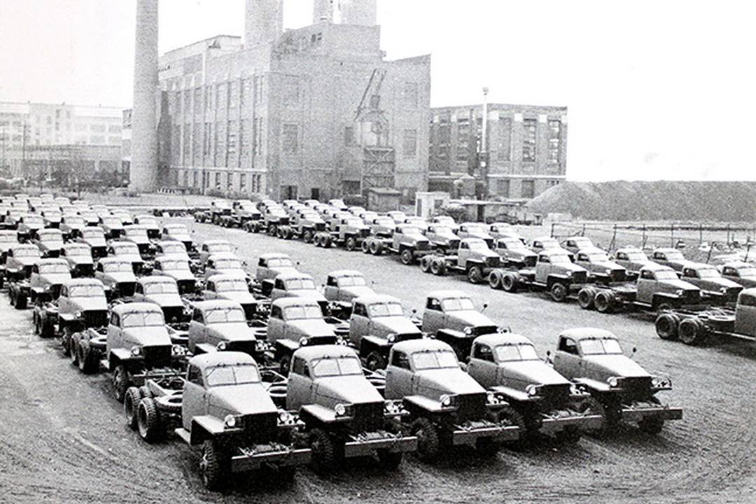 Подготовленные для отправки в СССР шасси Studebaker US6 для установки на них «Катюш» БМ-13