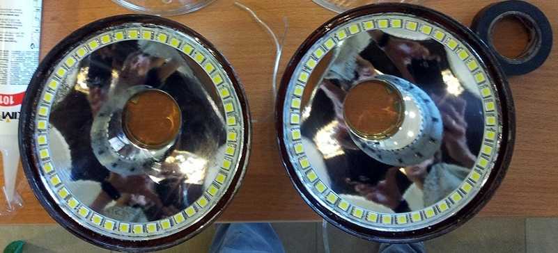 - Гибкая лента светодиодов, закрепленная вокруг противотуманной фары при помощи двухстороннего скотча.