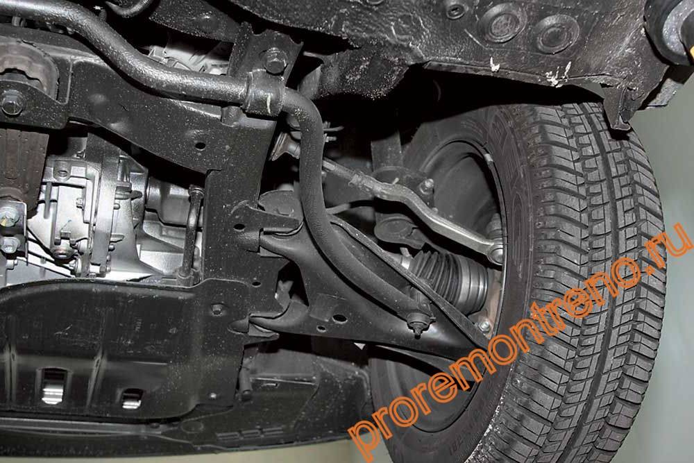 - Визуально оцените состояние подрамника, тяги стабилизатора и рычага на предмет механических повреждений.