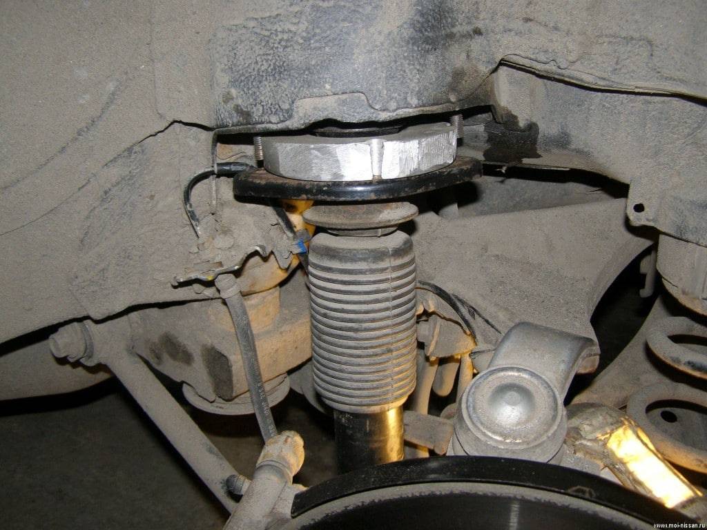 Гораздо лучше установить проставки между верхней опорой амортизаторной стойки и кузовом. Можно также найти в продаже увеличенные по высоте верхние опоры стойки. Еще вариант — вставить резиновую прокладку увеличенной толщины под пружину. Все эти способы позволяют сместить ось колеса относительно кузова на толщину проставки. Но смещение более чем на 15–20 мм опасно с точки зрения сокращения ресурса наружного шарнира равных угловых скоростей (ШРУС) — вплоть до его саморазборки. Кроме того, вал привода может опасно приближаться к подрамнику во время работы подвески.