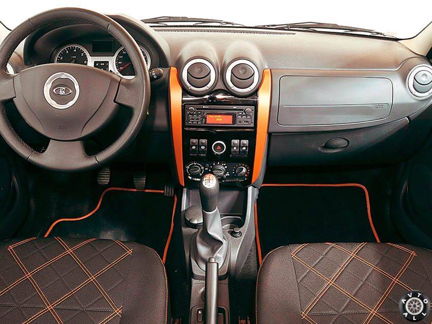 В дизайне интерьера внедорожной версии Кросс есть и некоторые особенности, такие как оранжевые вставки из кожи, которыми оформлены передние сиденья. Таким же цветом сделана строчка и клетка на сидениях, они являются своего рода украшением для всех сидений. Кроме этого, вставки из оранжевой кожи использованы и на центральной консоли, и на дверях. Такой дизайнерский ход позволил разнообразить салон Ларгуса, без каких-либо существенных затрат.