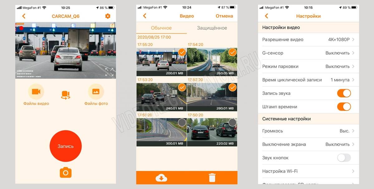 Модель Q6 способна подключаться к мобильным устройствам по Wi-Fi. Беспроводное соединение позволяет настраивать гаджет через смартфон при помощи специального приложения CARCAM Wi-Fi Auto. Приложение доступно как для iOS, так и для Android. Также пользователь сможет просматривать уже отснятые материалы или просто закачивать их в память смартфона, чтобы лишний раз не вынимать карту памяти и не трогать само устройство.