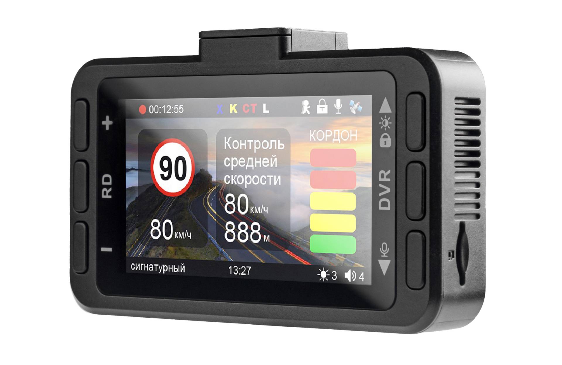Клавиши управления расположены слева и справа от экрана на передней панели. Их всегда хорошо видно и не нужно ничего нащупывать интуитивно, и тем более запоминать расположение. К тому же тут ДВА комплекта кнопок: персональные для радарной части (RD) и для видеорегистраторной (DVR).