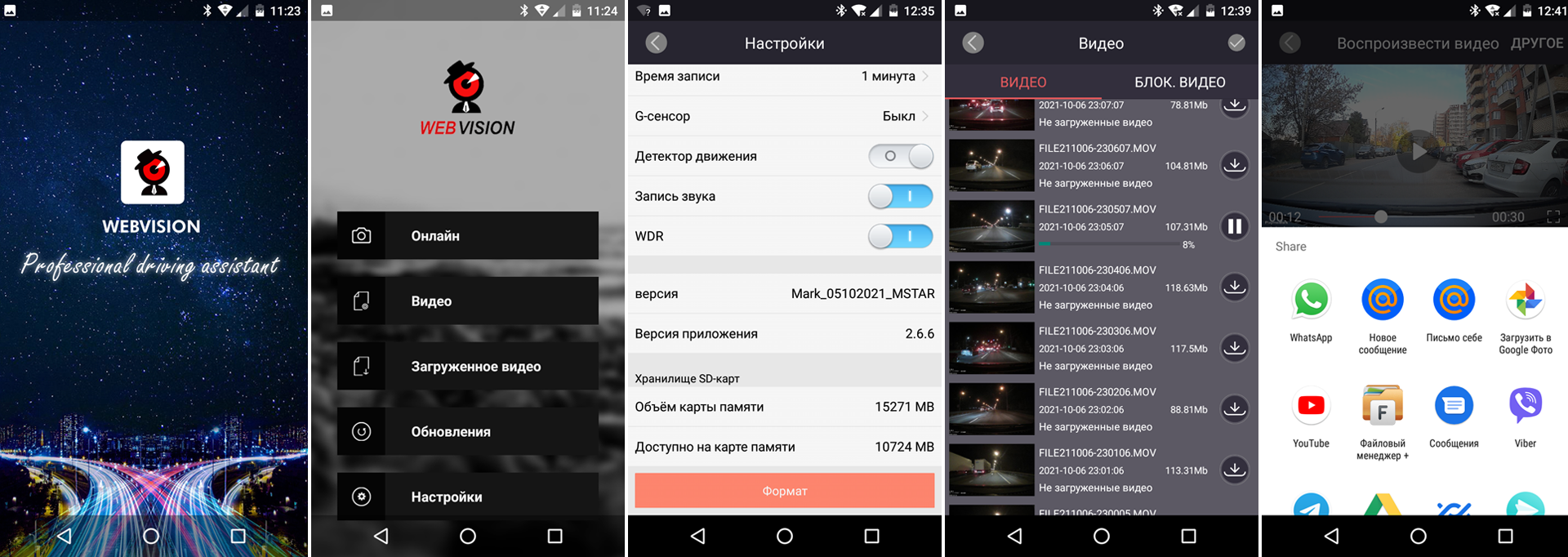С Playme MARK такого не произойдёт — как и все продвинутые приборы, он имеет Wi-Fi для связи с мобильным приложением. Оно тут называется Webvision А (доступно в Google Play и AppStore). С приложения можно обновлять базы камер и радаров, прошивку прибора, выполнять любые настройки, не пользуясь кнопками устройства, просматривать видео из памяти на большом экране смартфона или планшета, а также оперативно скачивать это видео или «расшаривать» любыми мыслимыми способами — отправлять в мессенджеры, на почту, в YouTube, Google Диск и так далее.