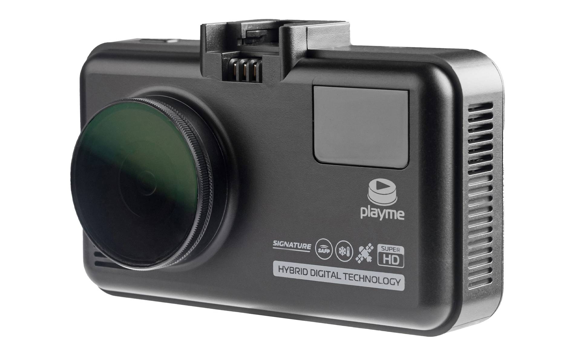 Playme MARK — это совершенно плоский корпус, за исключением небольшого «блинчика» объектива, и сочетание крупного трёхдюймового дисплея с кнопками на передней части. Габариты 96 × 55 × 23 мм, так что устройство отлично поместится в шофёрскую сумочку с ключами и документами.
