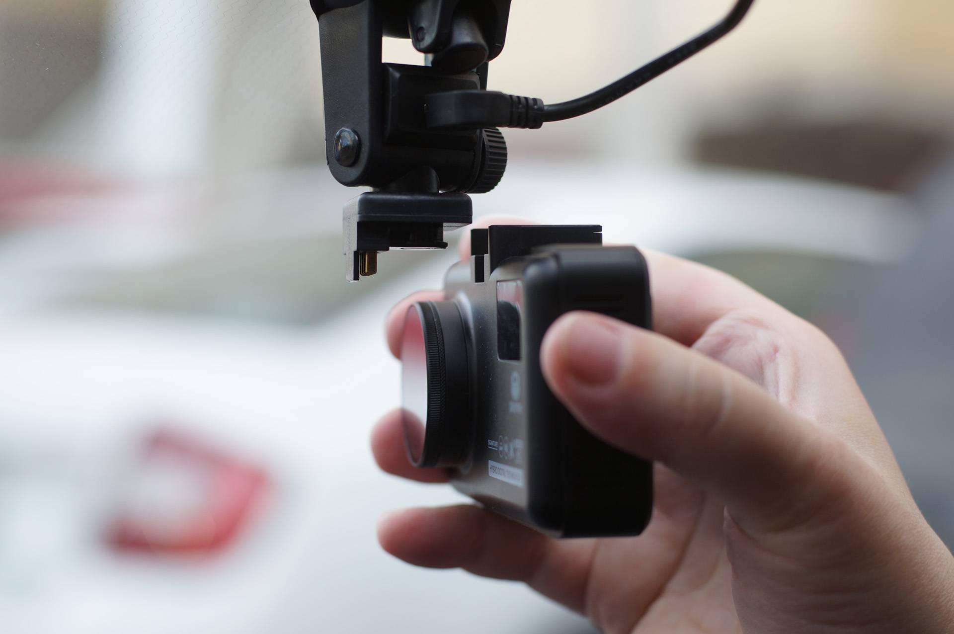 Слотовое крепление — это классика, которая уже уходит. Гаджет удерживается на кронштейне благодаря тому, что Т-образная часть кронштейна вставляется в паз на корпусе прибора. Регистратор держится за счёт трения и подпружиненного язычкового фиксатора, а питание подаётся через контакты ножевого типа. У такой технологии высокое качество фиксации, но вставлять и вынимать прибор по тугим пазам слота неудобно. А зимой, холодными пальцами — так вообще мучительно.