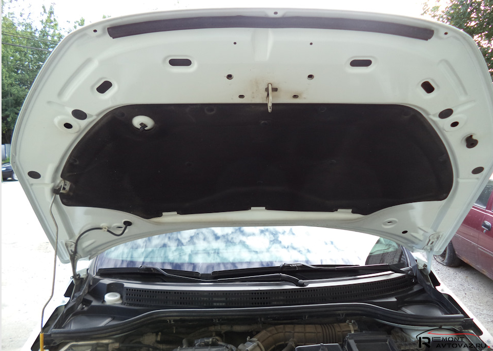 - Вытаскивают с помощью инструмента клипсы крепления обшивки капота.