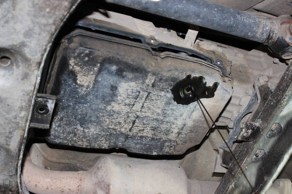 - После демонтажа защиты откроется доступ к пробке сливного отверстия. Откручиваем ее, после чего наблюдаем процесс вытекания старой жидкости, вместе с грязью и металлической стружкой