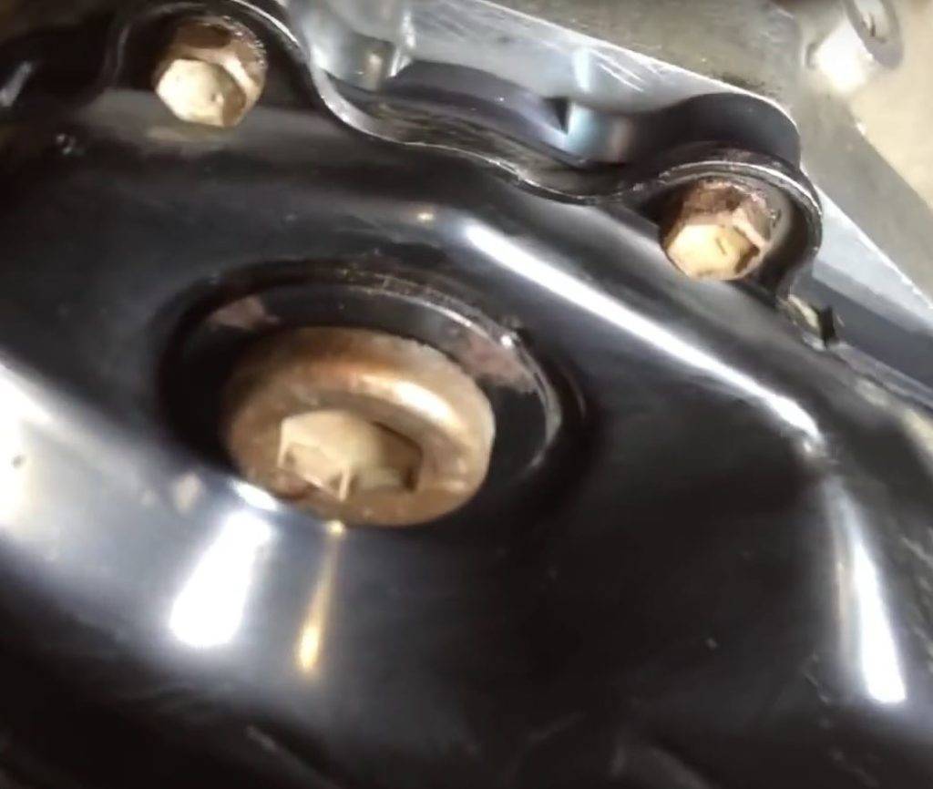 После этого с помощью шестигранного ключа на 17 отпускается пробка уровня и звёздочкой Т40 откручивается сливная пробка. Отработанное масло сливается в заранее подготовленную ёмкость. Затем следует снять так называемую защиту в виде двух поперечных кронштейнов, и можно приступать к откручиванию крепёжных болтов по периметру поддона. Для этого потребуется накидной ключ на 10 и трещётка для того, чтобы добраться до двух передних болтов, расположенных в труднодоступном месте. Извлекаются все болты, кроме двух, максимально отпущенных, но не выкрученных до конца. Эти два болта оставляются на месте для того, чтобы удерживать поддон при его наклоне для слива оставшейся в нём жидкости. При снятии поддона может потребоваться некоторое усилие, чтобы оторвать его от корпуса коробки: сделать это можно с помощью отвёртки или монтировки