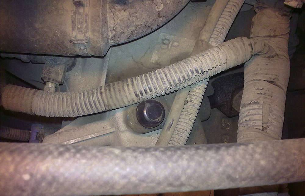 4. Подставьте тару под сливное отверстие и слейте старое трансмиссионное масло, затем ключом на “13” открутите пробку контроля масла, как я уже говорил, располагается она справа возле крепления полуоси с КПП.