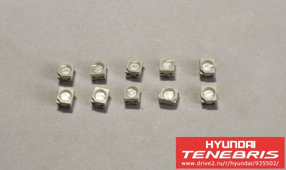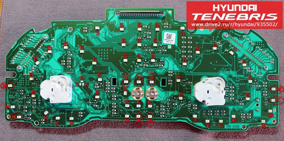 SMD 3528:Зеленые светодиоды — сопротивление 1,5 кОм + 1,5 кОм (суммарно (1,5+1,5)/2/2 = 750 Ом);Синий светодиод (дальний свет) — сопротивление 1,1 кОм + 1,0 кОм (суммарно 525 Ом);Красный светодиод (ручник) — сопротивление 1,3 кОм + 1,3 кОм (суммарно 650 Ом);Красные светодиоды — сопротивление 1,5 кОм + 1,3 кОм (суммарно 700 Ом);Желтые светодиоды (правая секция) — сопротивление 1,2 кОм + 1,3 кОм (суммарно 625 Ом);Желтые светодиоды (ABS, центральная секция) — сопротивление 1,5 кОм + 1,3 кОм (суммарно 700 Ом).