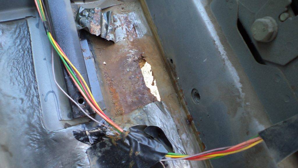 Далее убираем все, что будет мешать работе: крыло, подкрылок, пластиковые накладки, обшивку салона, сиденья, проводку и т.д. Должен остаться только голый металл. Как видим, в первую очередь от коррозии пострадали расположенная у порога часть передней арки, сам порог, особенно спереди и сзади, а также примыкающие к нему участки днища. Ситуация, можно сказать, классическая. С правой стороны картина была похожая, разве что немного печальнее.