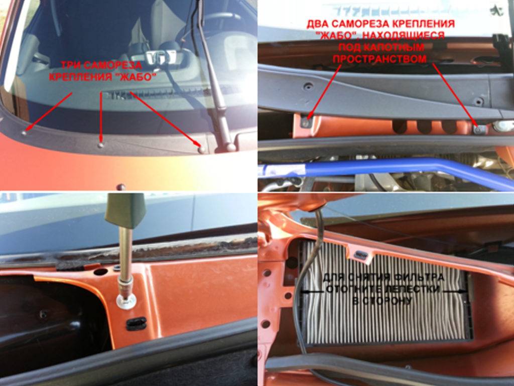 Для проведения замены откручиваем винты крепящие правую часть жабо и снимаем ее. Фильтр находится в правой части автомобиля (по ходу движения). Откручиваем шурупы крышки фильтра их 2 шутки и снимаем крышку. Фильтр демонтируем и устанавливаем новый в обратной последовательности.