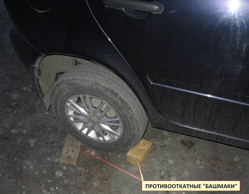 6. Затягиваем стояночный тормоз, включаем первую передачу и подставляем под колеса башмаки.