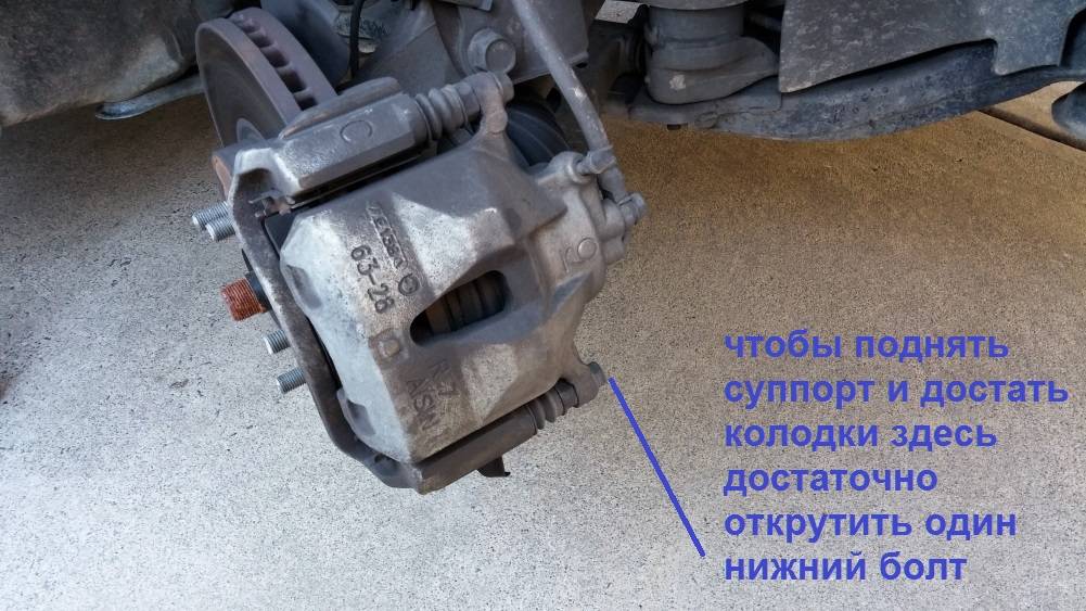 - определяем тот болт, который при откручивании позволит откинуть корпус суппорта, не задевая тормозной шланг (как правило, это нижний болт) и откручиваем его. Используйте WD-40, если болт не откручивается