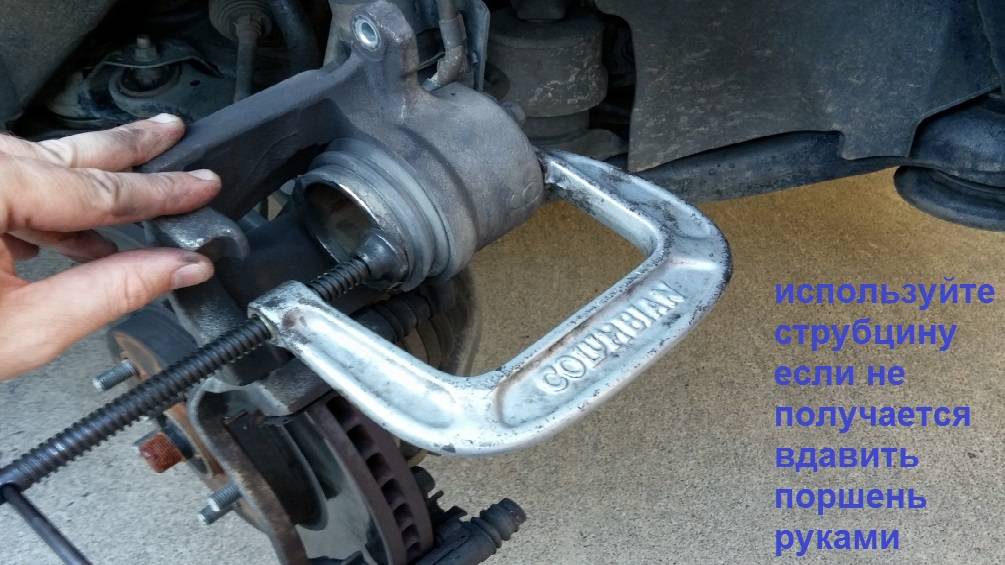 Устанавливаются новые колодки в обратном снятию порядке. Необходимо будет утопить поршень в тормозной цилиндр, а иначе новые колодки просто не встанут на своё место. Возьмите струбцину и установите её как показано на рисунке. Между струбциной и непосредственно поршнем поставьте какую-нибудь проставку (маленькую дощечку) и после всех операций начните заворачивать струбцину, дождавшись пока поршень полностью не утопиться в цилиндр.