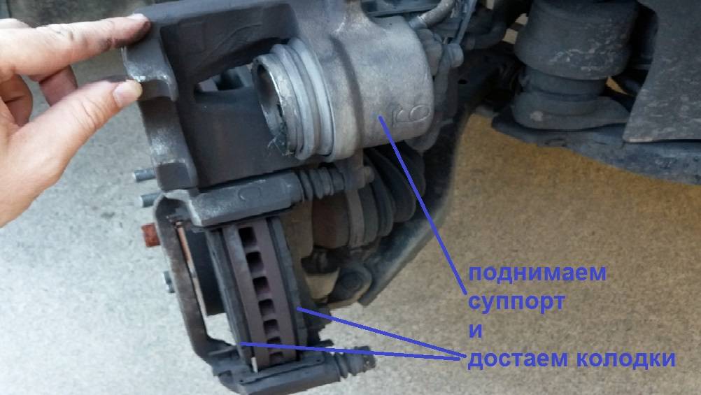 5) Откиньте скобу у суппорта вверх и снимите обе тормозные колодки, замените их новыми.