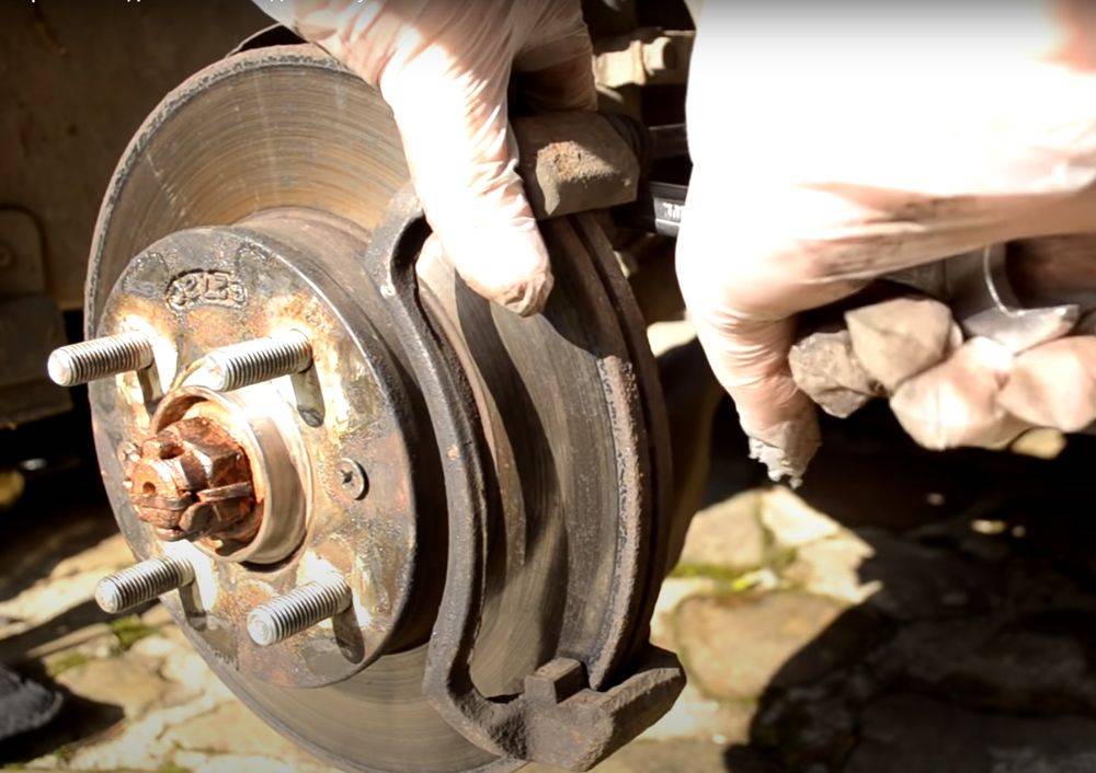 Если тормозной диск прикипел к ступице и не снимается, то стучим не слишком сильно по нем молотком, диск должен отойти. Кстати, чтобы диск не прокручивался, можно включить первую передачу, таким образом коробка заблокирует колесо.