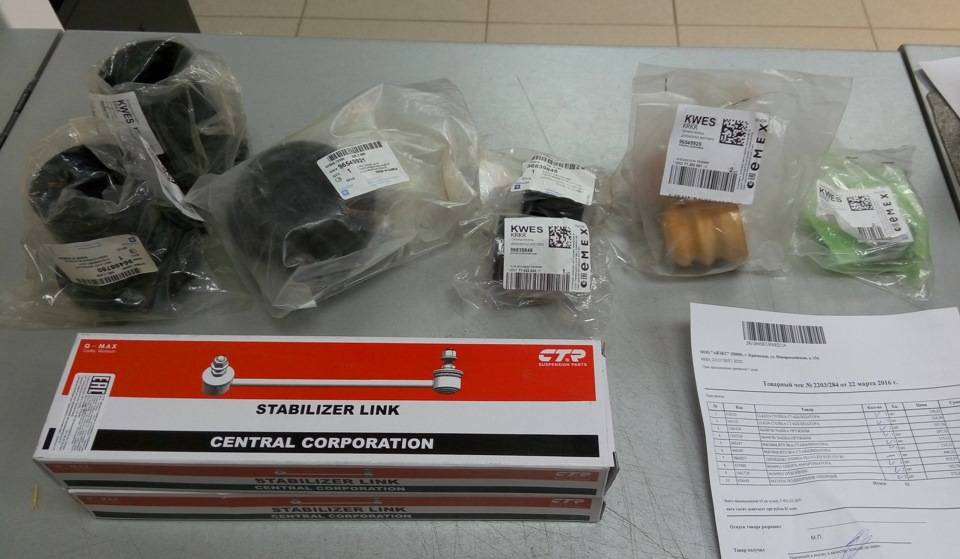 Установленные детали:GM 96839848 — Втулка стабилизатора переднего 2 шт. 228 руб.CTR CLKD-9 — Стойка стабилизатора правая — 355 руб.CTR CLKD-10 — Стойка стабилизатора левая — 359 руб.GM 96498780 — Пыльник амортизатора перед 2 шт. — 596 руб.GM 96549925 — Отбойник амортизатора перед 2 шт. — 1 486 руб.GM 94535236 — Подшипник опоры амортизатора 2 шт. — 546 руб.GM 96549921 — Опора амортизатора переднего 2 шт. — 1 872 руб.KYB 339030 — Амортизатор подвески передний левый — 2 550 руб.KYB 339029 — Амортизатор подвески передний правый — 2 620 руб.Работа по установке — 2400 руб.Сумма: 13 012 руб.