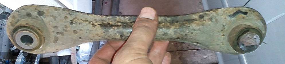 Остается открутить подпружинный рычаг. У меня это было самое сложное действие, оба рычага не захотели откручиваться и пришлось их спиливать. Это не очень приятно, особенно лежа под машиной, но что делать… надо! Рычаг крепится к балке болтом с эксцентриком и надо сделать два аккуратных пропила между рычагом и балкой. В итоге получаем вот такой старый рычаг со спиленным болтом.