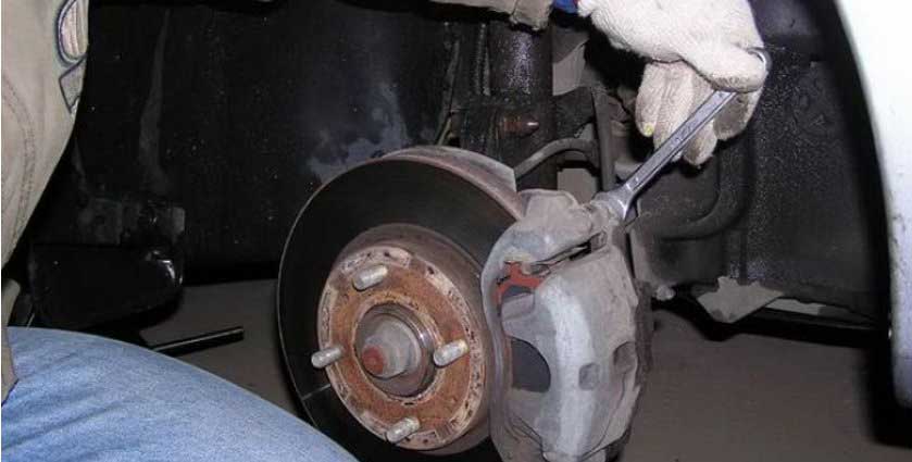- При помощи накидного ключа откручивают болт, который фиксирует суппорт.
