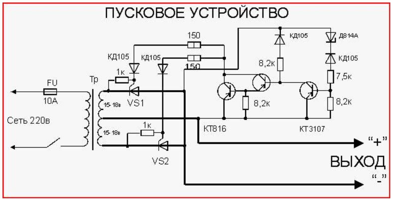 В этой схеме задействован лабораторный трансформатор ЛАТР. Вместо двух диодов можно использовать и диодный мост типа КЦ405. Схема пуско-зарядного устройства для автомобиля с усилителем: