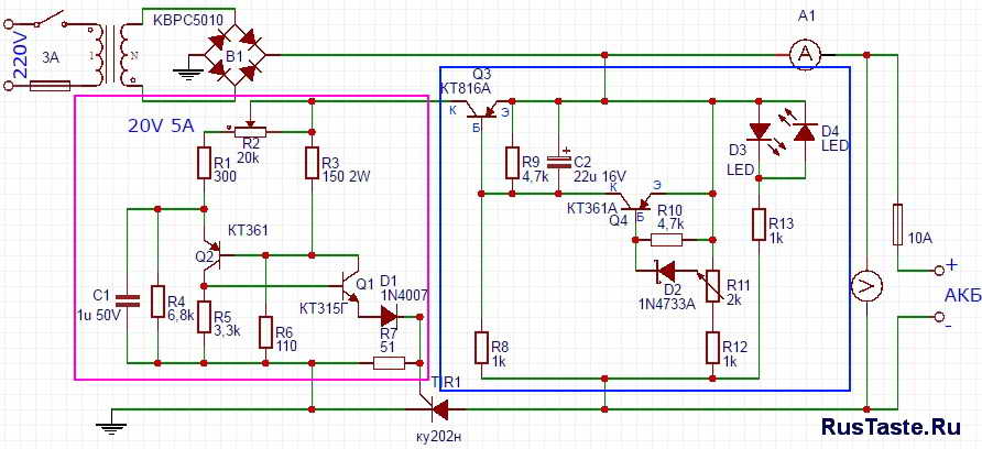 В этой схеме задействован лабораторный трансформатор ЛАТР. Вместо двух диодов можно использовать и диодный мост типа КЦ405. Схема пуско-зарядного устройства для автомобиля с усилителем: